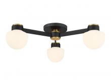 Give any room a boost of brightness with this 3-light semi-flush mount. It showcases a spectacular mid-century modern style with rounded shades of white opal glass. The finish combines Matte Black with Natural Brass accents for a timeless two-tone touch. 8.5" height, 30" width. Uses 3 candelabra size bulbs of up to 60 watts per bulb. Bulbs not included.