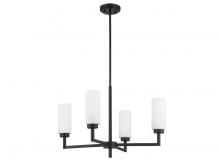 Get glowing with this angular, stylish 4-light chandelier. Each arm is finished in Matte Black and holds a tall, sleek cylinder of white opal glass for bright yet flattering light. This chandelier is 26" in width and has an adjustable height ranging from 17" to 71". It comes with four 12" downrods and one 6" downrod. Uses 4 candelabra size bulbs of up to 60 watts per bulb. Bulbs not included.