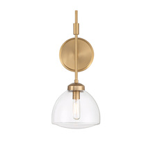 The Savoy House Corbin 1-light sconce brings a crisp, contemporary lighting look to any wall. A molded, curved clear glass shade encases the light source and the Warm Brass finish is beautifully versatile. Corbin is 15" in height, 6.75" in width and extends 8" from the wall. Uses one candelabra size bulb of up to 60 watts. Bulb not included.
