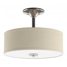 Harkening back to a simpler time, the Inspire Collection semi-flush mount ceiling light freshens traditional forms with clean lines. The two-light brushed nickel semi-flush mount features an etched glass diffuser with an off-white linen shade. This fixture is suitable for a variety of design styles, including transitional, traditional and farmhouse and the simple design is a perfect for a variety of locations throughout the home.