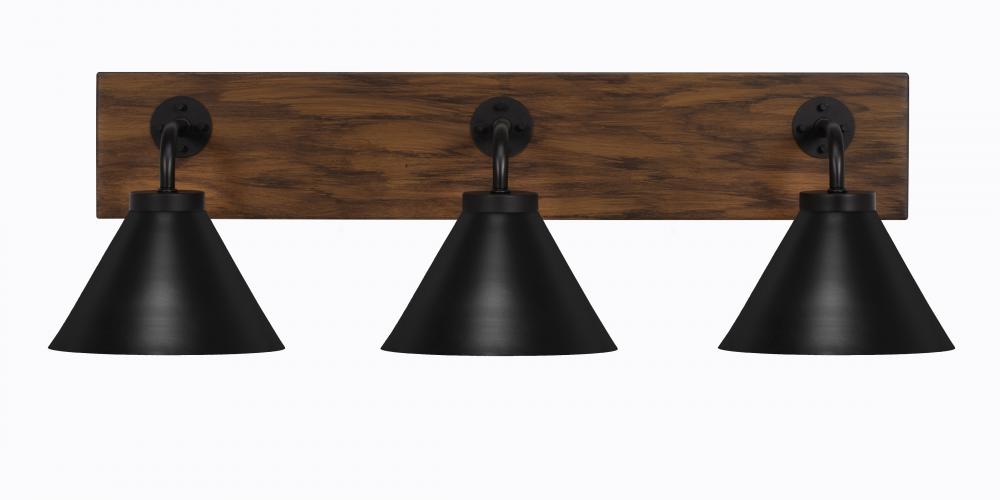Toltec Lighting 1773-MBWG-421-MB Oxbridge 3 Light Bath Bar Shown In Matte Black & Painted Wood-look Metal Finish With 7 Matte Black Cone Metal Shades