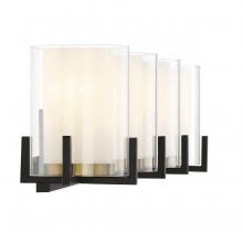 The Savoy House Eaton 4-light bath vanity light has an elegant and appealing look with shades of clear and white opal glass, jewelry-like prong detailing and a two-tone finish of black and brass. Create the illusion and beauty of candlelight with Eaton! This bath light is 7.5" in height, 33" in width and extends 7.5" from the wall. Uses four standard size bulbs of up to 60 watts per bulb. Damp area rated.