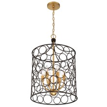 The open and airy drum-shaped pendant features bronze metal rings linked together to create a graphic pattern that stands out against the inner antique gold angular arms. This pendant is sure to inject a pop of personality into a room.