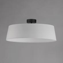 Truncated tapered cones of linen shades diffuse light from an LED ring within them. The LED lighting offers ample illumination that is softly diffused behind the shade. A two-pronged fork detail supports the ring within further modernizing this transitiona